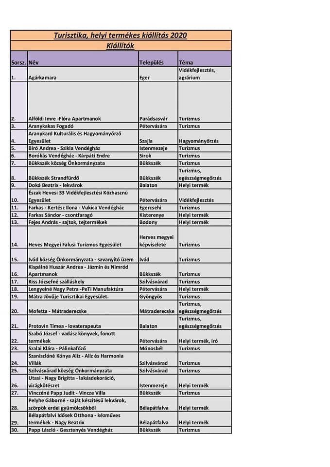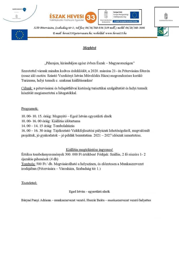 Még lehet jelentkezni és regisztrálni azoknak a helyi termelőknek, turisztikai szolgáltatóknak, akik szeretnének részt venni a március 21-én, Pétervásárán megrendezendő egész napos szakmai kiállításon. Az Észak Hevesi 33 Vidékfejlesztési Közhasznú Egyesület, az Agrárminisztérium és az Agrárfejlesztésekért Felelős Irányító Hatóságának összefogásával megvalósuló program a város fő terén zajlik majd tíztől délután négyig.