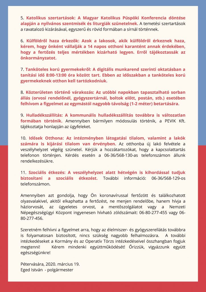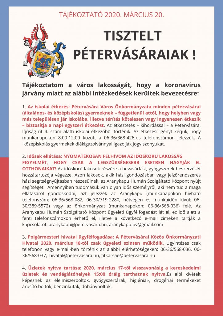 Tisztelt Pétervásáraiak! Tájékoztatom a város lakosságát, hogy a koronavírus járvány miatt az alábbi intézkedések kerültek bevezetésre:
