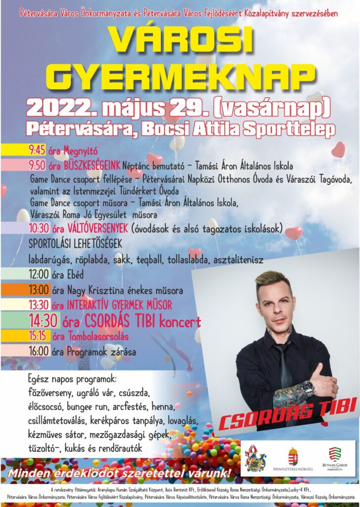 Idáén is megrendezzük a városi sport pályán a hagyományos gyermeknapi rendezvényünket, melynek időpontja : 2022. május 29. vasárnap
