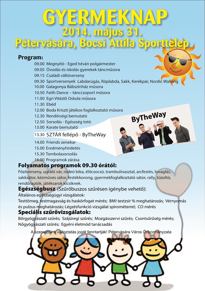 Természetesen idén is megrendezésre kerül a hagyományos Gyermeknap a Bocsi Attila Sporttelepen. A dátum 2014-ben is május utolsó szombatja; május 31-e.